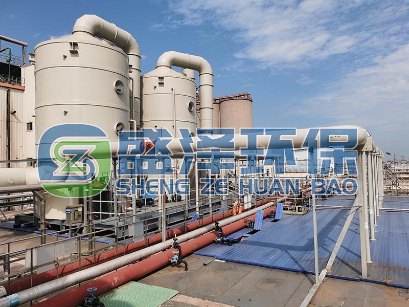 噴淋塔主體材質為PP,堿洗塔內置有填料(PP),氣液接觸比表面積大。循環液通過噴淋,均勻分布至填料層,充分和廢氣接觸,優化氣液比。洗噴淋最上端噴淋組件的上部設有除霧器,廢氣穿過循環液噴淋層后,再連續流經除霧器(PP絲網)時,除去廢氣中所含液滴。堿噴淋塔設有二級噴淋,增加處理效果。