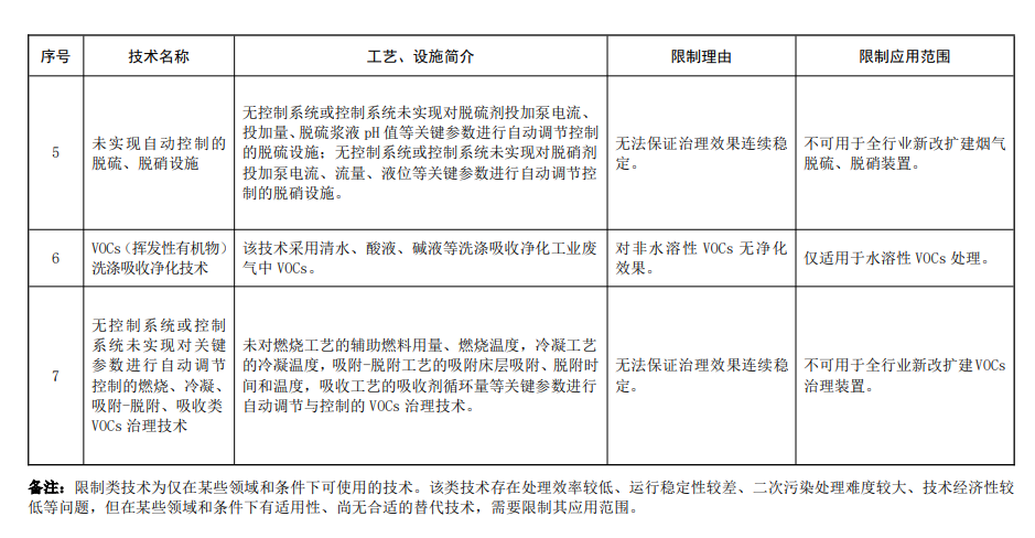 其中限制類7 項,淘汰類13項,涉及除塵、脫硫脫硝、VOCs治理等大氣污染防治細分領域。