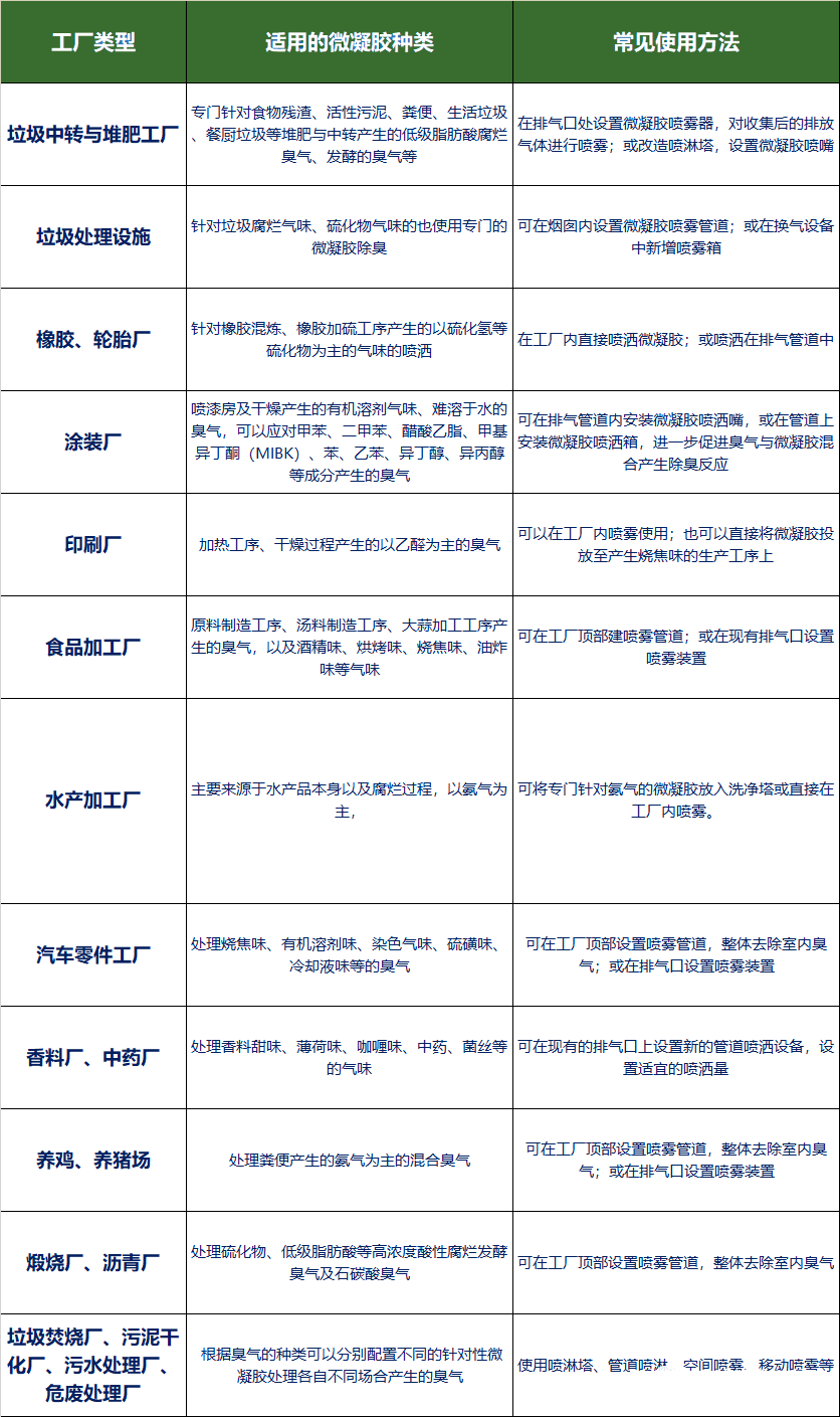 以上是微凝膠較為常見的使用方法,而微凝膠因種類眾多,如果根據臭氣成分進行針對性除臭,效果就更加理想。各行各業的臭氣源不同,臭氣成分不同,需要使用不同類型的微凝膠,以下為例子為不同工廠的微凝膠種類及常見使用方法。