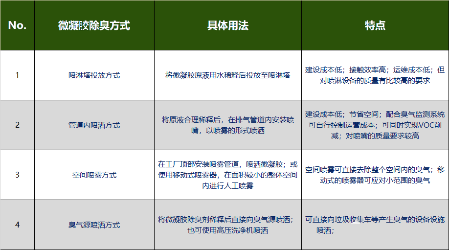 表2 微凝膠除臭劑在各類工廠內主要的使用方法