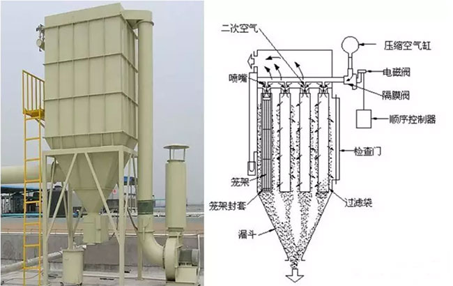 濾袋采用壓縮空氣進行噴吹清灰,清灰機構由氣包、噴吹管和電磁脈沖控制閥等組成。過濾室內每排濾袋出口頂部裝配有一根噴吹管,噴吹管下側正對濾袋中心設有噴吹口,每根噴吹管上均設有一個脈沖閥并與壓縮空氣氣包相通。清灰時,電磁閥打開脈沖閥,壓縮空氣經噴由清灰控制裝置(差壓或定時、手動控制)按設定程序打開電磁脈沖噴吹,壓縮氣體以極短促的時間按次序通過各個脈沖閥經噴吹管上的噴嘴誘導數倍于噴射氣量的空氣進入濾袋,形成空氣波,使濾袋由袋口至底部產生急劇的膨脹和沖擊振動,造成很強的清灰作用,抖落濾袋上的粉塵。